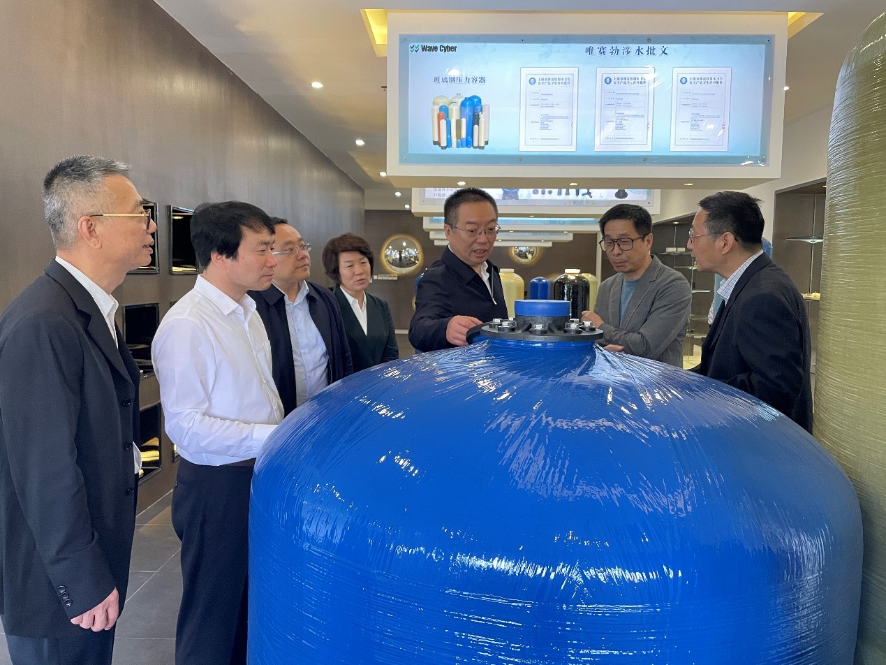 李春临一行参观了公司的产品展示厅,认真听取公司介绍,观摩了公司反渗透及纳滤膜系列产品、膜元件压力容器、复合材料压力罐等三大类产品的功能和应用场景,并就公司各类产品的生产过程、核心技术以及市场前景进行了充分交流。