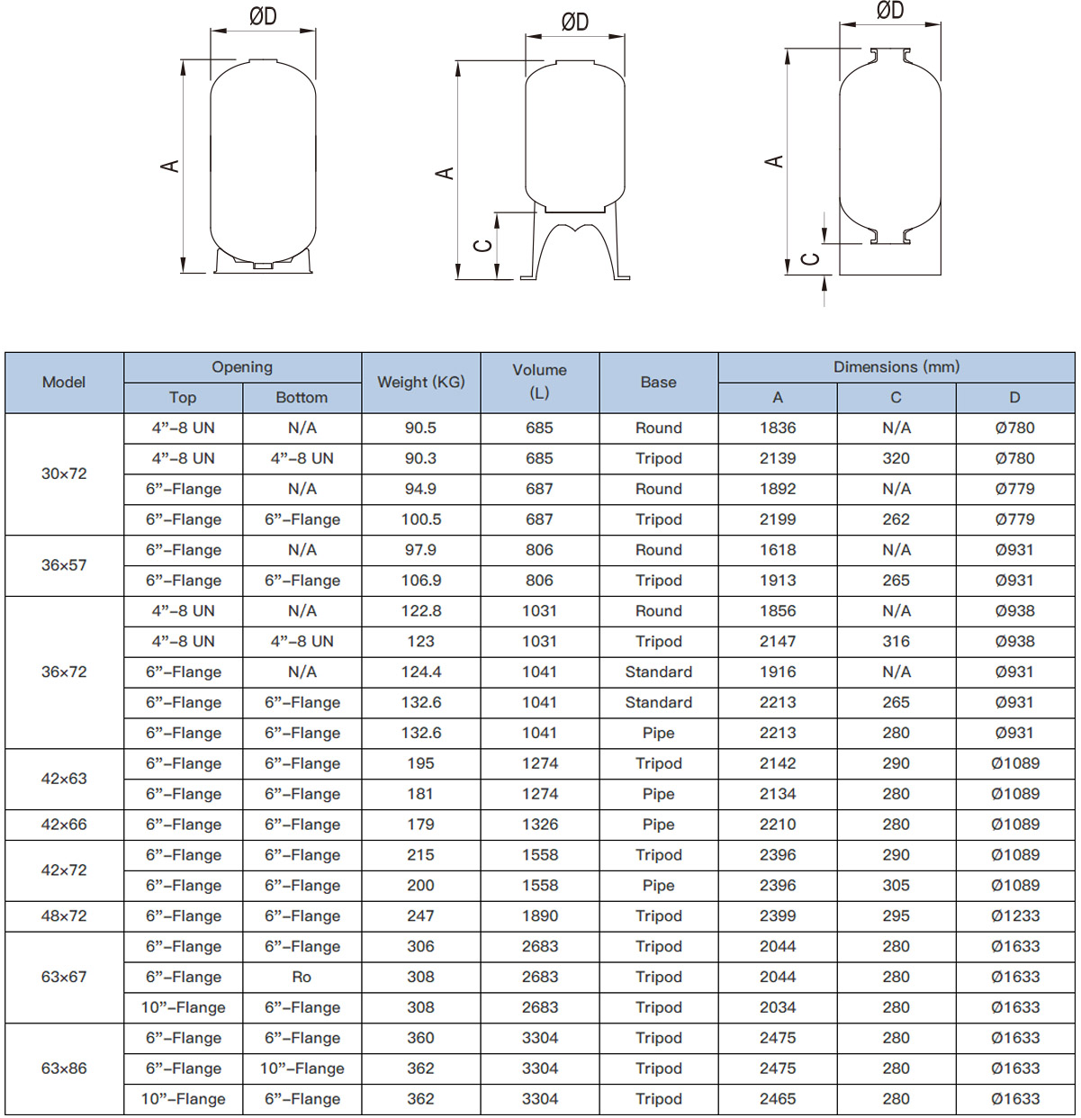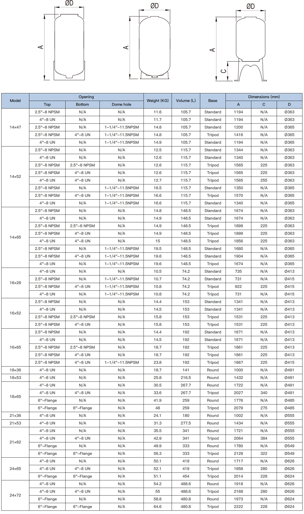 We have a wide range of composite pressure tanks, including 5"-13" for residential application; 14"-24" for commercial application and 30"-63" for industrial application. ASME, NSF and KTW certifications have been obtained for the products.